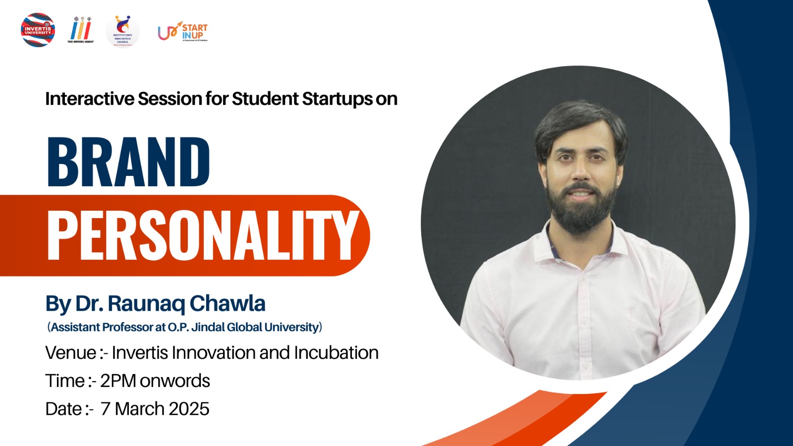 A workshop on Brand Personality Development was conducted by Dr. Raunaq Chawla on 7th March 2025 at the Invertis Innovation and Incubation Foundation, Invertis University. The session focused on helping students and aspiring entrepreneurs understand the importance of building a strong, consistent, and authentic brand personality in today’s competitive market. Dr. Chawla shared valuable insights into brand identity, audience perception, and strategic communication, blending theoretical concepts with practical examples and interactive activities. The workshop provided participants with essential tools and frameworks to craft compelling brand narratives, enhancing their personal and professional brand presence.